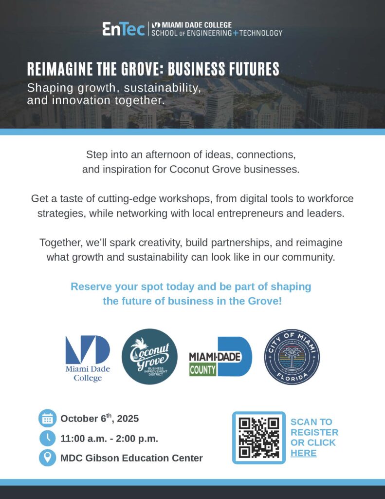 Coconut Grove businesses in the BID are invited to “Reimagine the Grove: Business Futures,” part of an ongoing series offered by Miami Dade College School of Engineering and Technology’s (EnTec). Dedicated to ideas, connections, and inspiration, the afternoon of cutting-edge workshops will happen Monday, Oct. 6, 2025, from 11 a.m. to 2 p.m. at the MDC Gibson Education Center.