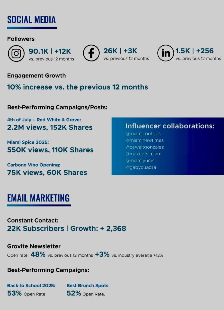 Recent campaigns underscore that impact. Signature events such as Red, White & Grove generated more than 2.2 million views, while restaurant openings, retail activations, and Miami Spice promotions consistently drove high engagement and shares. Influencer collaborations further expanded reach, introducing local businesses to new customers through authentic, trusted voices.
