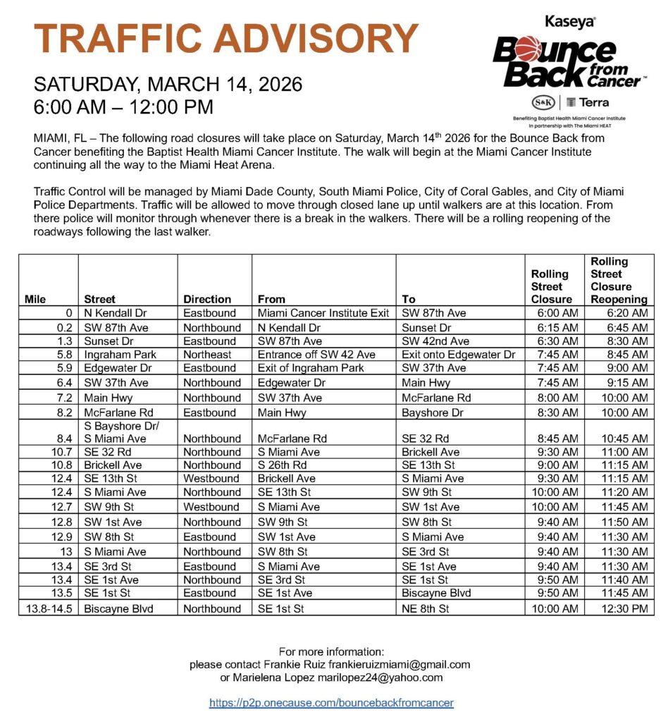 While the temporary closures may cause short-term inconvenience, organizers note that the event supports an important cause — bringing the community together to support cancer patients, survivors and ongoing medical research at Baptist Health Miami Cancer Institute.