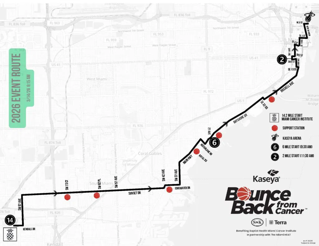 The event, benefiting Baptist Health Miami Cancer Institute and held in partnership with the Miami HEAT, raises funds and awareness for cancer research, patient care and survivorship programs. The route begins at Miami Cancer Institute and proceeds toward the Kaseya Center, with participants traveling through several municipalities including South Miami, Coral Gables and the City of Miami.